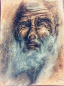اجتياح اللِّحْيَة مساحة كبيرة من الوجه دليل على عدم الراحة والقلق دائم، وكأنه ينتقل من نزوح إلى آخر دون أن يجد مأوى … اللِّحْيَة بلون دخاني أنه احتراق داخلي طاف على السطح، لكن في التأمل أكثر يبدو وكأن اللِّحْيَة كتلة صخرية،