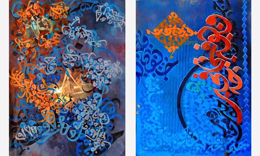 وتظل المقاربة مغمورة بكل سياقات المادة الحروفية التي تنصهر في اللون بكل طبقاته التي يتسلل إليها الضوء بجمالياته، وهي تتسم بوجود توليف بين التشكيل والمضامين، وبذلك، فإن المادة الحروفية التي ينجزها المبدع بتقنيات عالية يجلي في مظهريتها بعض المضامين والدلالات. وهي ترتبط بالتدرجات اللونية التي تعضدها الخطابات الحروفية، التي تظل رهينة التأويلات المختلفة والقراءات المتعددة الناتجة عن تلاحم اللون والخط، في بؤر تشكيلية ذات معان فنية، وقيم جمالية؛ لأن البناء التشكيلي المدجج بالحروفيات عموما يعتمد في جوهره على المادة المتصلة بالتركيب والشكل، وهو ما ينجزه المبدع في الفضاء، وفق خاصيات تشكيلية ذات إضافات فنية يلعب فيها اللون والشكل والتقنية والمقاس أدوارا محورية لبعث الجمال، وإضفاء التعبير بأسلوب حروفي مبهج، إذ يسخر المسلك التشكيلي بما يحمله من ألوان تتدرج وفق طبقات، لخدمة الحروفيات بألوانها التي تتمظهر هي الأخرى وفق طبقات وبعلامات ضوئية متوهجة، وأشكال وطرق تعبيرية غاية في الجمال، تتوقف على مناح متعددة القراءات.