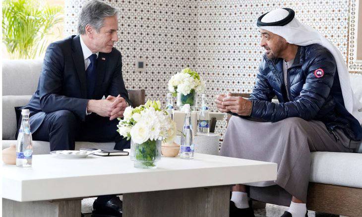 فبعد لقاء في وارسو مع وزير الخارجية الأوكراني، قطع أنتوني بلينكن، وزير الخارجية الأمريكي، أكثر من ألفي ميل جنوبا للضغط ومصافحة أيدي مسؤولي حلفاء تلعب دولهم دورا في تشكيل النزاع. وكانت أول زيارة له إلى الكيان الصهيوني لحضور لقاء غير مسبوق مع وزراء خارجية عرب في صحراء النقب، ثم سافر بلينكن إلى العاصمة المغربية الرباط، حيث التقى مع ولي عهد أبو ظبي، محمد بن زايد الذي استقبله في قصر يملكه هناك.