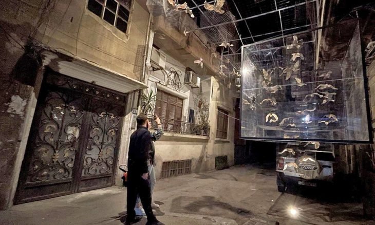 تبدأ الرحلة من مدخل زقاق «طالع القضة». عشرات الحمامات البيضاء والسوداء تتدلى من السماء، وقد يحتار الناظر إليها أي اللونين يرى، فمع اهتزاز المجسمات المتقاربة المعلقة على حوامل معدنية، يتداخل الأبيض والأسود بشكل قد يصعب الفصل بينهما، ربما على غرار كثير من تفاصيل حياتنا خلال العقد الأخير. يحمل العمل عنوان «دحض» وهو للفنان جوان شعبو. على بعد خطوات، عُلقت طاولة خشبية كبيرة، وفوقها حمامات تحت كل واحدة منها «صينية» معدنية صغيرة. العمل هو «العشاء السرّي» للفنان بيير حاماتي، ويفتح الاحتمالات لشتى الأفكار، من الصواني الفارغة التي تشبه أطباق السوريين وهم يكافحون لتحصيل لقمة عيشهم، إلى الحمامات التي قد تبدو شريرة للحظة وكأنها تنقض لسرقة طعامنا، ولوهلة أخرى وادِعةً وترغب في مساعدتنا. ويصف الفنان عمله بأنه يحاكي ما فقده السوريون خلال الحرب، من حب ورغبة وإيمان وأمان وماء وكهرباء وطعام.