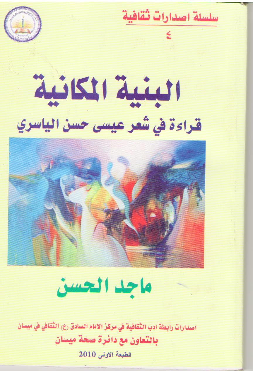صدر للناقد والشاعر العراقي ماجد الحسن كتابه النقدي البنية المكانية /قراءة في شعر عيسى حسن الياسري وتناول الكتاب ثلاثة مباحث الاول مقتربات البعد المكاني والمبحث الثاني الشاعر والمكان فيما تناول في المبحث الثالث تشوفات البعد الرابع الكتاب من القطع المتوسط ب 117 صفحة .