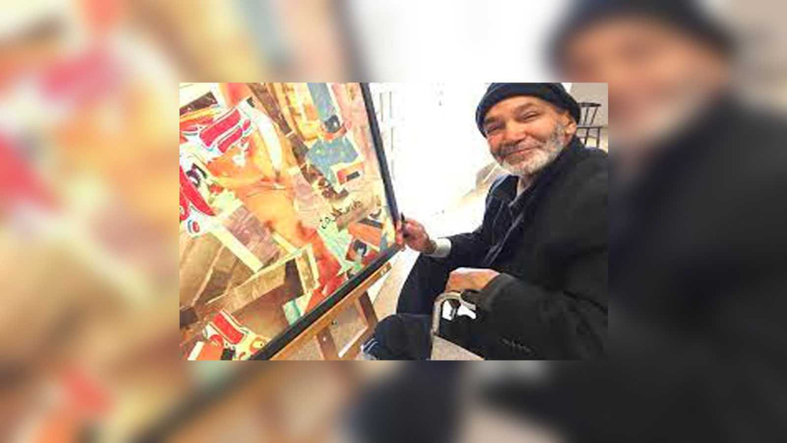 وفي اللوحة التي استُخدمت كملصق للمعرض، نرى شخصية ذات أرجل قصيرة تمشي وتستمر في المشي ممسكة رزمة من الورق تحت ذراعها، وهي صورة تشبه كثيرا حياة هذا الرسام العصامي التكوين وكثير الحركة، ومن خلال تكثيف استعمال الخطوط المستقيمة والمتوازية، يخيّل لمن يتأمل هذه اللوحة أن الشخصية تتحرك بسرعة.