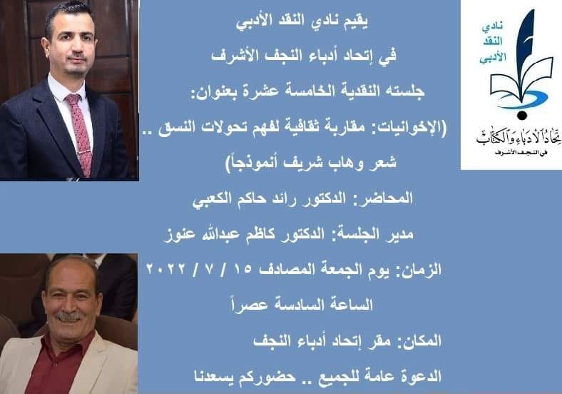 أقام نادي النقد الأدبي في اتحاد أدباء النجف الأشرف، جلسته النقدية الخامسة عشرة عن الإخوانيات في شعر وهاب شريف.