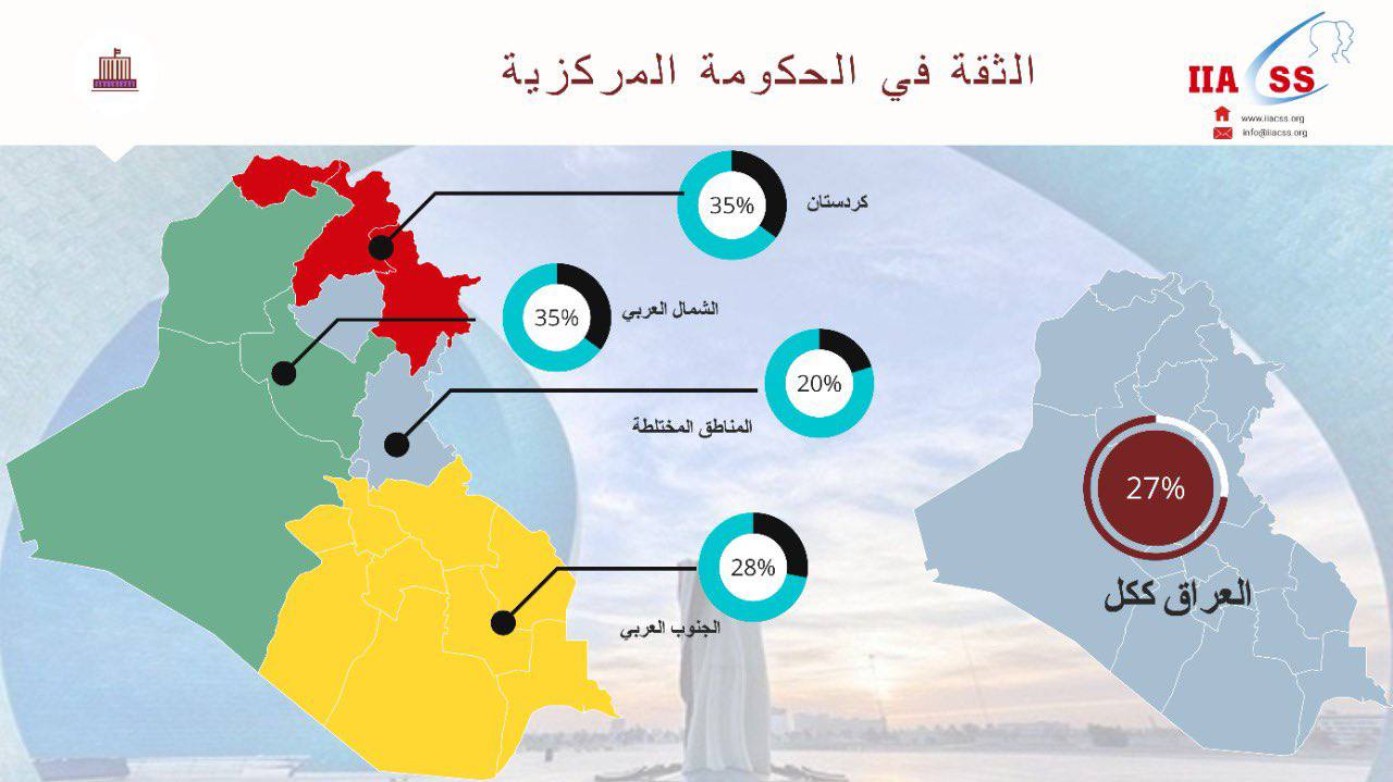 وأضاف داغر أن “أقل نسبة ثقة ظهرت في المناطق المختلطة (بغداد وديالى وكركوك)، تليها محافظات جنوب العراق”.