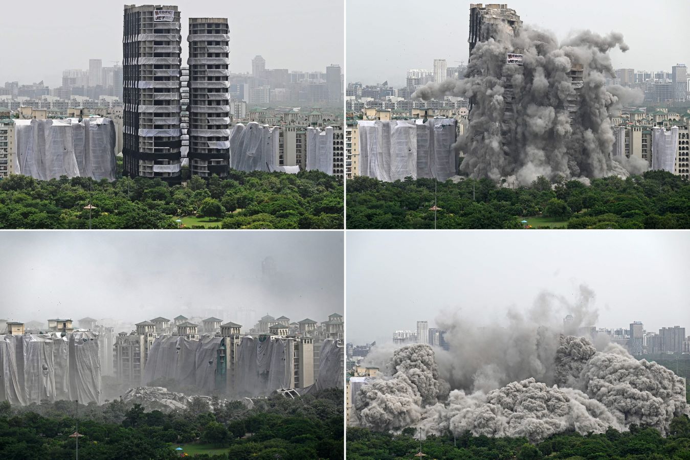 وشكّل هدم “البرجين التوأم”، اللذين يبلغ ارتفاعهما 100 متر في منطقة نويدا، وهي بمثابة غابة من الإسمنت تكثر فيها المباني المماثلة، نموذجاً نادراً في الهند على تعامل السلطات بحزم مع المطورين العقاريين الذين يلجأون إلى طرق ملتوية لتمرير مخالفاتهم. ولم تستغرق عملية التفجير سوى ثوانٍ قليلة، وتسببت في سحابة ضخمة من الغبار والحطام بفعل انهيار البرجين “أبيكس” (32 طبقة) و”سيان” (29 طبقة) اللذين يضمان مجتمِعَين نحو ألف شقة، لم يسكنها أحد خلال تسع سنوات من النزاعات القضائية.