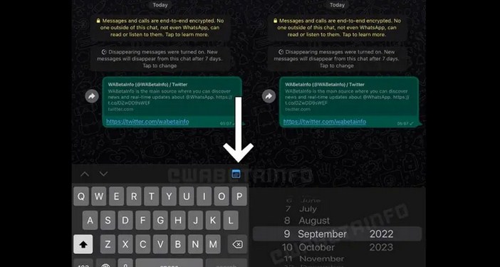 ومن أجل استخدام خيار البحث عن رسالة ذات تاريخ محدد، يحتاج المستخدم إلى النقر على “أيقونة التقويم” هذه عبر هاتف “أيفون”. كما أوضحت لقطات الشاشة أيضًا أنه سيتم فتح أيقونة التقويم بنقرة واحدة، ثم بعد ذلك سيظهر منتقي التاريخ لتحديد أي شهر وتاريخ وسنة؛ ما يمكن المستخدم في النهاية من الوصول إلى رسالة معينة يرغب في البحث عنها بكل سهولة.