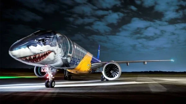 أقلعت طائرة ركاب من طائرات شركة لوفتهانزا السويسرية التابعة للوفتهانزا الأم من مدينة زيورخ، متوجهة إلى ميامي بالولايات المتحدة، وجسمها متوشّح بإطار من جلد سمك القرش. وأعلنت شركة الطيران في زيورخ، أن هذا سوف يحد من استهلاك الوقود ويقلل من انبعاثات ثاني أكسيد الكربون.