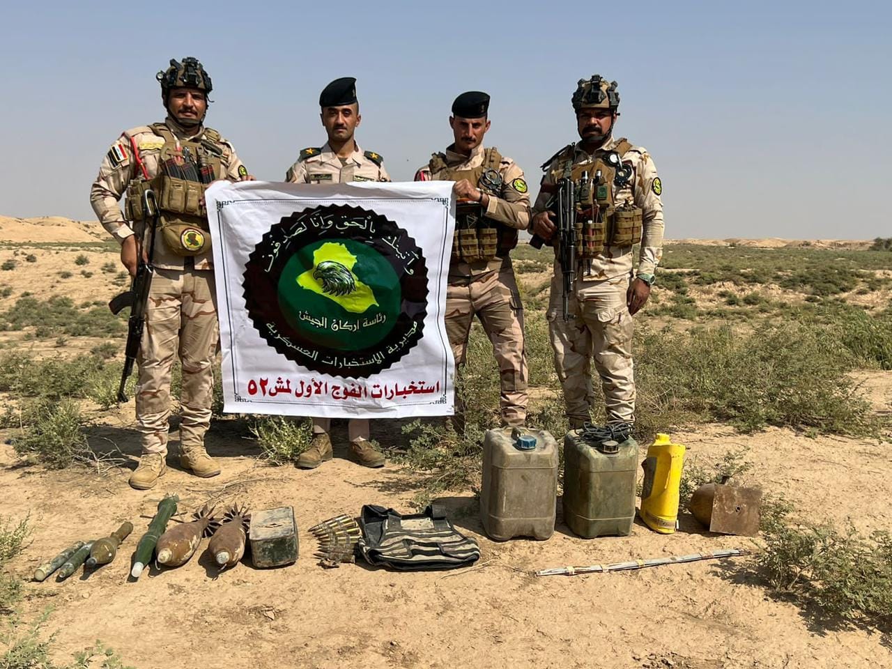 واضاف، ان “مفارز الاستخبارات العسكرية تمكنت من ضبط كدس للعبوات والاعتدة يحتوي على( 61 ) صاروخا من نوع SPG9 ضد الدروع والاشخاص ونمساوي و ( 10 ) عبوات ناسفة محلية الصنع ومختلفة الاشكال و ( 4 ) مساطر تفجير و ( 3 ) اجهزة نوكيا و ( 2 ) شريط احادية 12.5 و حاوية عتاد 12.5 و درع و ( 2 ) ناظور هاون”.