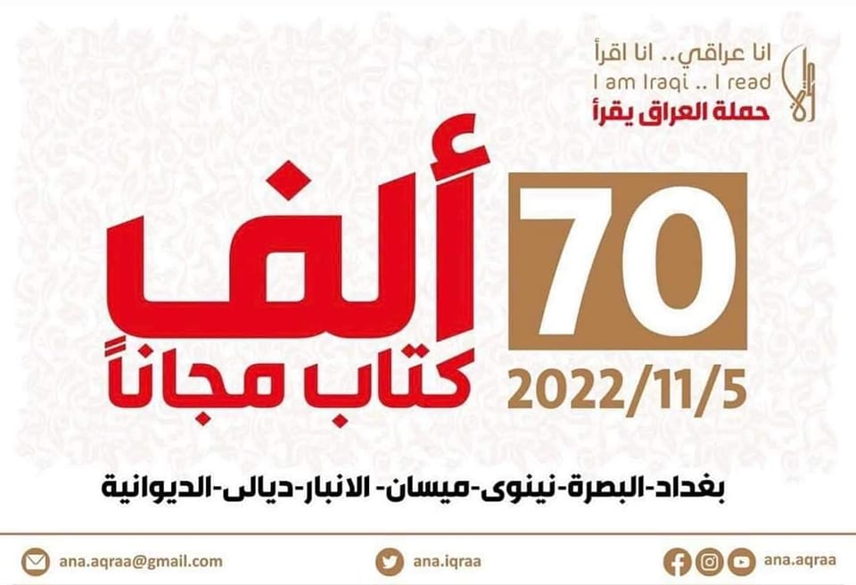 تبدأ يوم السبت المقبل أكبر فعاليات مهرجان “أنا عراقي أنا أقرأ ” وهو مهرجان خاص بالقراءة المجانية في العراق ستشهد فعالياته ٧ محافظات ضمن حملة العراق يقرأ.