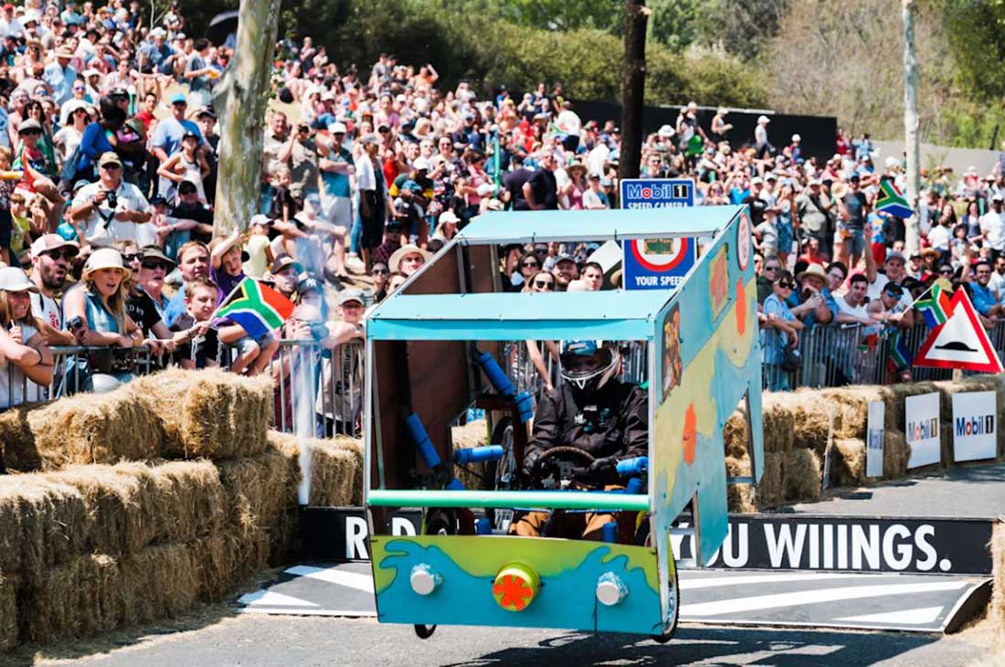 تنافسَ نحو 50 سائقاً في سباق أقيم الأحد في مدينة كيب تاون بجنوب إفريقيا لمركبات محلية الصنع مثبتة على أربع عجلات لكنّها من دون محرّكات، إذ تتحرك بدفع من القوة البشرية والجاذبية .