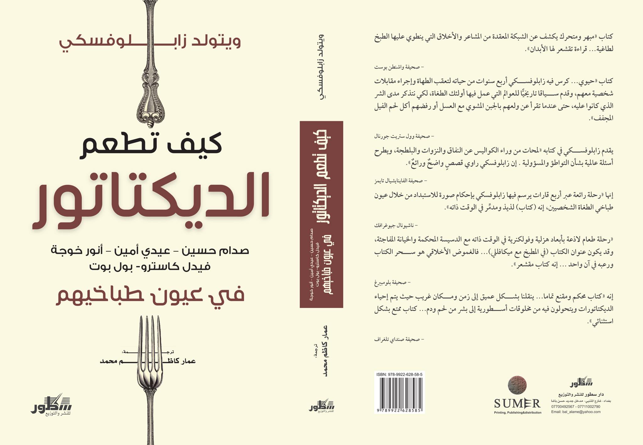 صدر عن دار سطور للنشر والتوزيع في بغداد كتاب الصحفي والكاتب البولندي زابلوفسكي المعنون ” كيف تطعم الديكتاتور” بترجمة عمار كاظم محمد والذي حاور فيه خمسة طباخين رافقوا خمسة طغاة حول العالم وهم صدام حسين و عيدي امين و فيدل كاسترو وانور خوجة و بول بوت .