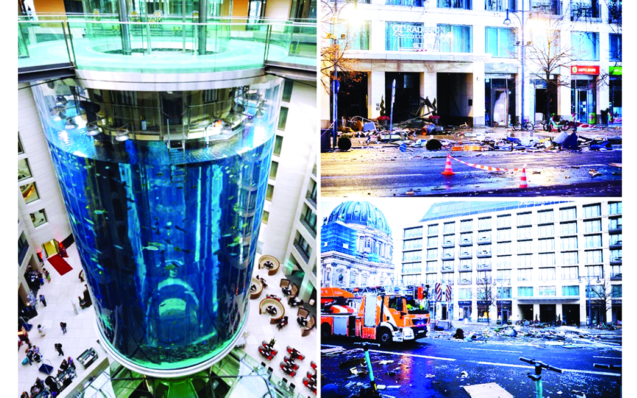 انهار حوض أسماك ضخم يبلغ ارتفاعه نحو 12 متراً في بهو أحد فنادق برلين الألمانية الفخمة، ما أدى إلى تدفق أكثر من مليون لتر من المياه مع الأسماك التي كانت تحويها ووقوع جريحين، على ما أعلنت الشرطة وعناصر الإنقاذ.