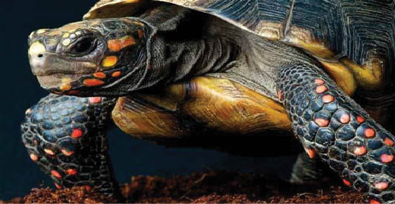 السلحفاة ذات القدم الاحمر ، كما تسمى احيانا سلحفاة السافانا ، وهي تعدّ واحدة من افضل السلاحف اذا كنت تريد تربيتها كحيوانات اليفة ، وهي عادة ما تكون صغيرة نسبيا وملونة وتعيش لمدة طويلة,وتم العثور على السلحفاة حمراء القدم في مناطق الغابات المدارية والرطبة في امريكا الجنوبية ، فتسكن جواناس، فنزويلا، البرازيل، الإكوادور وباراجواي وتوجد ايضا هناك علي بعض جزر البحر الكاريبي ، وعادة ما تعيش السلاحف حمراء القدم في الشجيرات العلفية واشجار الفاكهة ،فهي تتغذي عليها وعلى النباتات ايضا ، كما انها تأكل الحيوانات الميتة ايضا,وهي واحدة من السلاحف الاكثر تلوينا ، وجلدها يمثل درعا بالنسبة لها ، ويتراوح لونها من البني الداكن إلى الاسود مع بقع اخف في مناطق معينة مثل منطقة حول الحواف فعادة ما تكون هذه المنطقة احمر مصفر ، وهناك ايضا بقع على رأس السلحفاة حمراء القدم وهي عادة ما تكون باللون البرتقالي، والاصفر او الاحمر ، فنظرا لمجموعة الاماكن الكثيرة التي تنشأ فيها ، فتتلون بالوان متغيرة دائما ,وهناك سمة وصفية للسلحفاة حمراء القدم وهي انها تأخذ شكل جسم الكبار، وهذه الصفة تكون اكثر وضوحا في الذكور اكثر من الإناث ، فنجد جانبي الدرع يصبح مقعر اكثر ، ويعطيها ما يقرب من ما يسمي “الخصر” ، وحجم السلحفاة حمراء القدم يعتبر متوسط، ولكنها تبقى صغيرة نسبيا فيصل طولها من (30 – 40 سم) ، وبالنسبة لمعظم الانواع يكون الذكر اكبر قليلا من الانثى، ويكون اطول، وله ذيل واضح ,فالسلاحف حمراء القدم هي من الحيوانات النهمة، فتتناول كل من المواد الحيوانية والنباتية في الطبيعة ، وتقوم في الأسر بالتغذية على سلطة مختلطة من الفواكه والخضار كل يوم ، كما انها يجب ان تتغذى على بعض الاغذية التي تحتوي على نسبة اعلى من البروتين مرة او مرتين في الاسبوع ، ومعظم السلاحف حمراء القدم تتغذي على الفئران الميتة والفراخ الميتة ايضا، ولكن البعض من اصحاب السلاحف يفضلون اطعامها الغذاء التجاري ذات الجودة العالية على الاقل مرة واحدة في الاسبوع ، ومما لا شك فيه ان هذه المكملات الغذائية مهمة لنظامهما الغذائي,وينبغي ايضا ان تقدم الماء في صحن مسطح كبير ، فيمكن ان يكون وعاء فضلات القطط مناسباً ، اهم شيء احضار وعاء يمكن للسلحفاة ان تصعد داخله وخارجه بسهولة ، او صحن كبير من البلاستيك والذي يمكن تنظيفه وتعقيمه بسهولة مرة واحدة في الاسبوع او على حسب الحاجة ,والسلاحف حمراء القدم تتطلب دائما البيئات الحارة الرطبة ، ويمكنك بناء بيئة ملائمة لها فيمكن ان يكون الخليط نصفه من الرمل ونصفه الاخر من الطحالب ، كما انه يمكن ايضا وضع طبقة من النشارة فوق الجزء العلوي من الصندوق الخاص بالسلحفاة للمساعدة في الحفاظ علي الرطوبة ، ويمكنك إضافة اكوام من الاوراق الجافة، والتبن، والنباتات لكي تعطي المظهر الطبيعي لصندوق السلحفاة حمراء القدم ’السلحفاة حمراء القدم تعدّ من السلاحف الغريبة للغاية حيث انها لا تفعل مثل باقي السلاحف وتتراجع في قشرتها ، بل انها تظل خارج قشرتها لتنظر حولها وتري ما يجري ، فاتضح من العينات التي تم جمعها من الرضع الموضوعة في الاسر ان هذه السلاحف قابلة للتفاعل اليومي بشكل غير عادي ، كما انها على مدى سنوات عديدة تصبح اكثر ترويضاً ويصبح التعامل معها اكثر سهولة ، ولكن يبقي كل ما هي تحتاجه توفير مجموعة متنوعة من الملاجئ لإعطائها الشعور بالامان,وتوجد معظم السلاحف حمراء القدم في الموائل الدافئة وبالتالي، تبدأ تظهر لديها مشاكل في الجهاز التنفسي ، وتعدّ العلامات المبكرة لهذه الامراض هي عيون منتفخة، سيلان الانف، ولذلك ينبغي ان نسعى دائما في الحفاظ على الصندوق الخاص بالسلحفاة حمراء القدم حارة ورطبة لتجنب هذه القضايا الصحية,وايضا هناك مشاكل اخرى قد تقابلها مثل الطفيليات الداخلية ، فالبعض من هذه السلاحف عادة ما تكون تربية مزارع ويتم انتاجها باعداد كبيرة ، وتنتج هذه الطفيليات بداخلهم نتيجة اكلهم كمية كبيرة من تربة هذه المزارع ، فإذا كنت 