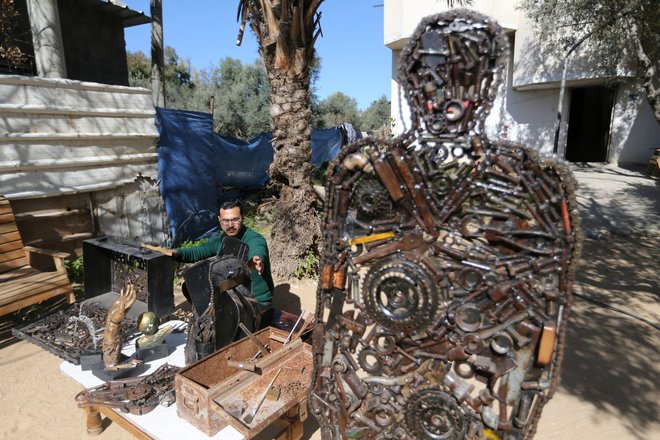 يحوّل الفنان الفلسطيني عساف الخرطي، قطع الخدرة المعدنية والأدوات التي لم تعد صالحة للاستخدام إلى أعمال فنية.