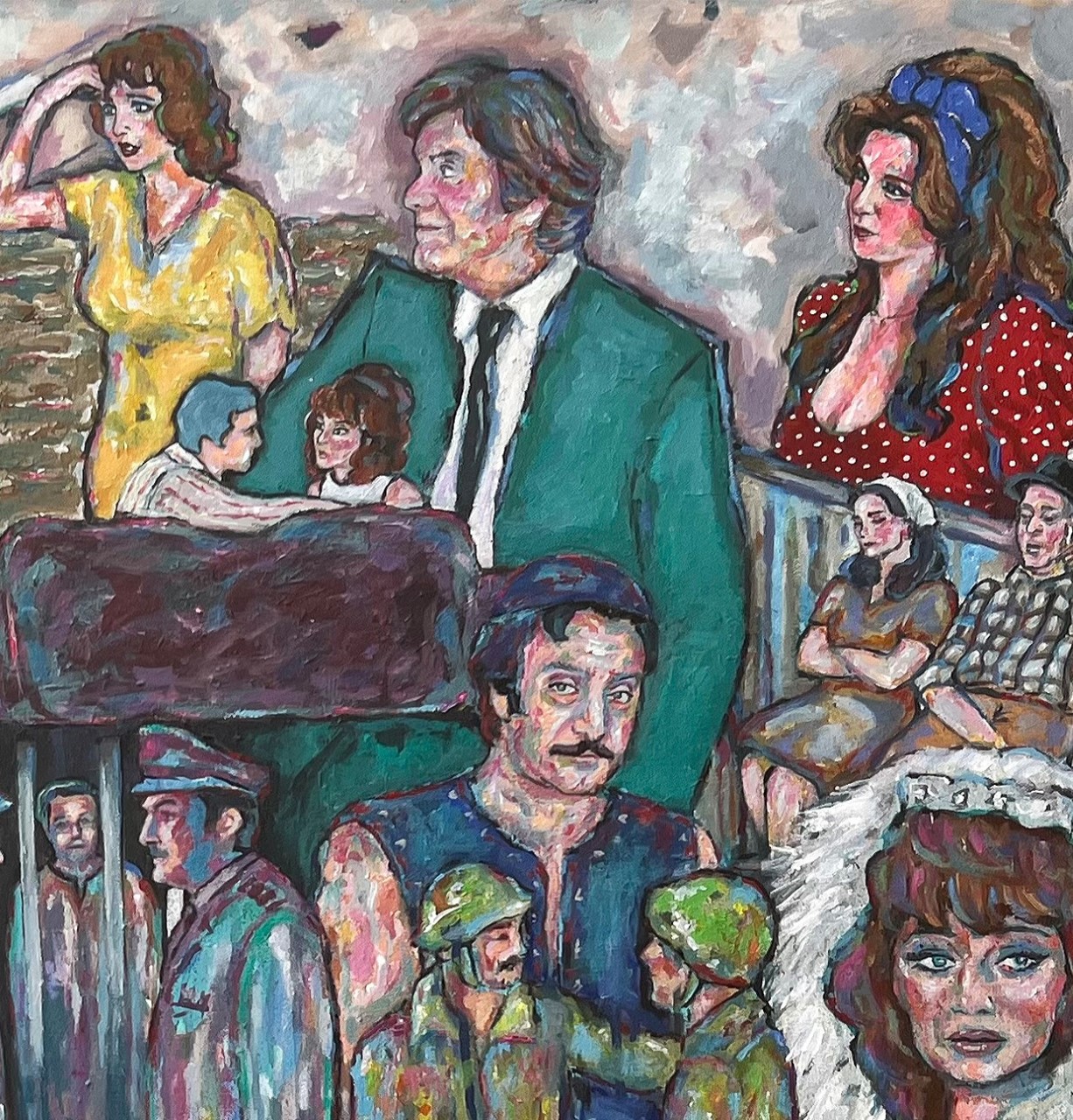 في هذه اللوحة تُعبر الفنانة نور هشام السيف عن علاقتها المركبة مع الصورة السينمائية؛ هذه الصورة التي تشكل جانباً مهماً من وعينا البصري. تعكس هذه اللوحة التي وقع عليها الاختيار كواجهة للمعرض طبيعة الأعمال الأخرى المعروضة، والتي تشغل السينما حيّزاً كبيراً من محتواها البصري. كثير من المشاهد التي تعالجها الفنانة في أعمالها المعروضة مستلهمة من كادرات سينمائية، حتى يمكن بسهولة التعرّف من خلالها على وجوه بعض نجوم السينما المعروفين.