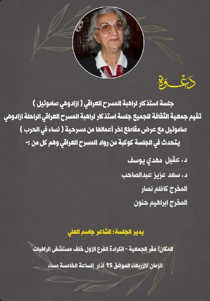 تقيم جمعية الثقافة للجميع، اليوم الأربعاء، جلسة استذكار للفنانة المسرحية “ازادوهي صاموئيل” التي توفيت عن عمر ناهز الثمانين عاماً، يشارك فيها عدد من المختصين في العمل المسرحي والذين سبق لها الاشتراك في أعمالهم المسرحية كممثلة.