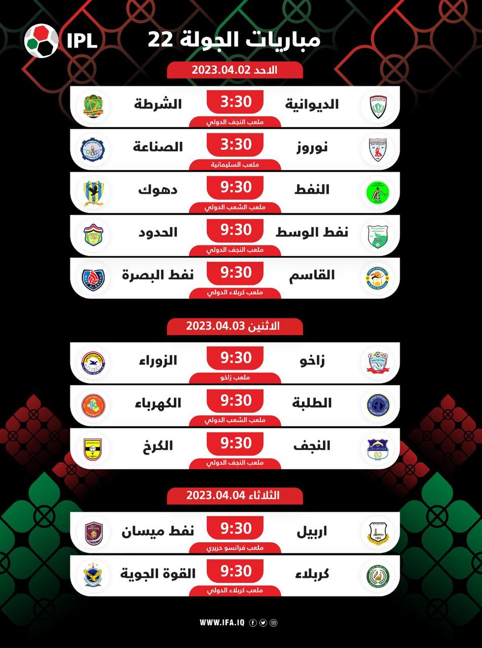 أعلنت لجنة المسابقات التابعة للاتحاد العراقي لكرة القدم، أن مباريات الجولة 22 من الدوري الممتاز ستنطلق في الثاني من نيسان المقبل على مدار 3 أيام.