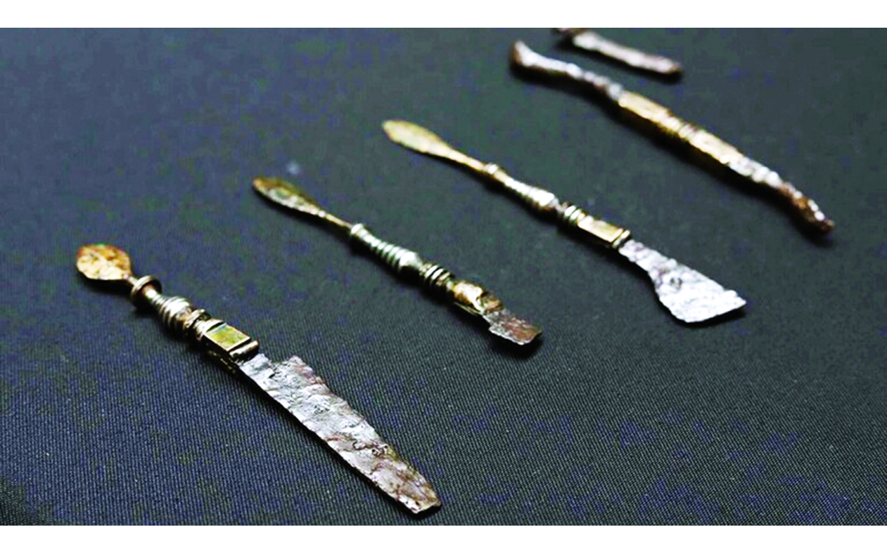 ويضيف الموقع: “من ضمن الأدوات الجراحية التي عثر عليها العلماء مشارط مصنوعة من سبائك نحاسية مطلية بالفضة، وشفرات فولاذية قابلة للاستبدال، وملاقط وإبر وحجر خاص، ربما كان يستخدم لخلط مكونات الأدوية”.