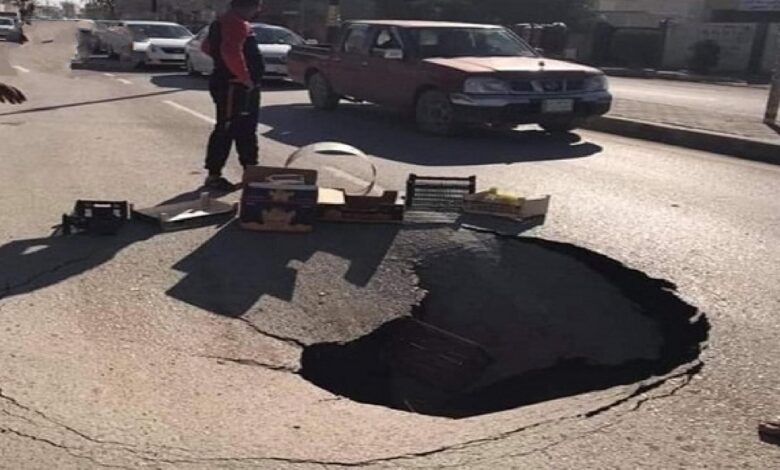 أدى تخسف أرضي في أحد شوارع كمب سارة بمنطقة الكرادة وسط بغداد، إلى قطع الشارع الحيوي منذ أيام، فيما وعدت أمانة بغداد بإصلاحه خلال يومين كحد أقصى.