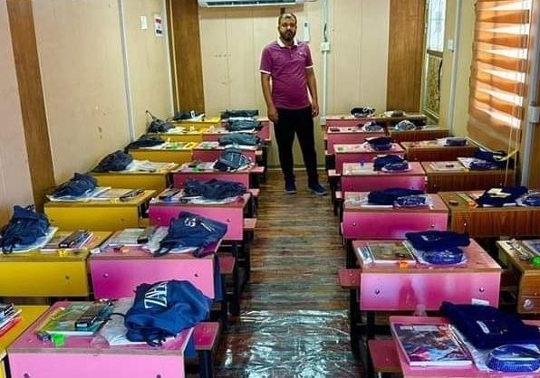 شرع الشاب يوسف نجم الزهيري من الناصرية بتأثيث أحد الصفوف وشراء جهاز تبريد وقرطاسية وملابس للتلاميذ بعد تعيينه على ملاك وزارة التربية.