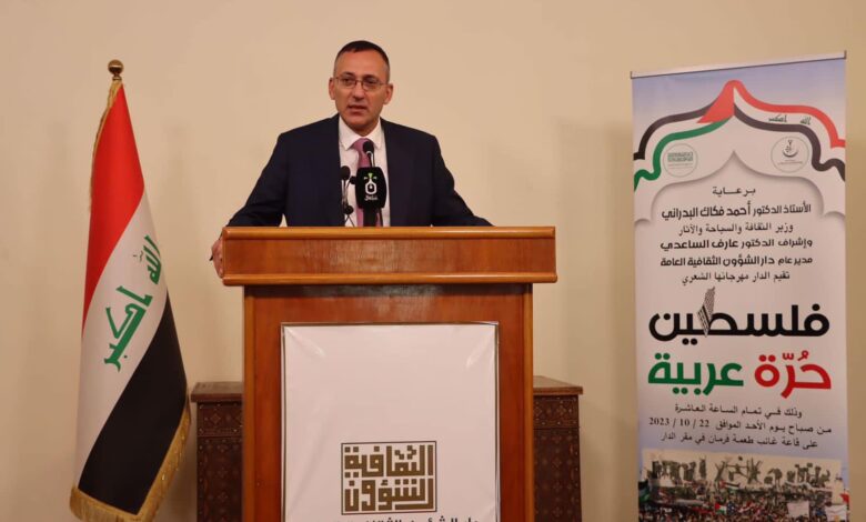 وألقى الكلمة الدكتور أحمد البدراني وزير الثقافة والسياحة والآثار ” متضامناً مع أبناء الشعب الفلسطيني وهم يخوضون معركة الشرف والعز ضد العدو الصهيوني المحتل لأرضهم والمغتصب لحقوهم ،وثبات الموقف العراقي المساند للأشقاء في فلسطين ودعم قضيتهم المصيرية، لافتا إلى أهمية توحيد جهود الشعب الفلسطيني”،معربا عن تعازيه لعوائل الشهداء وتمنياته للمصابين بالشفاء العاجل.