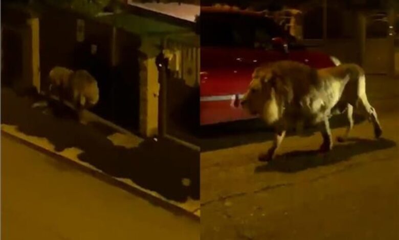وأظهرت لقطات فيديو نشرها هواة على الإنترنت اللحظة المروعة التي شوهد فيها أسد هارب وهو يتجول في شوارع أحد الأحياء ليلاً.