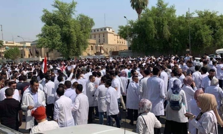 تظاهر العشرات من أطباء التشريح وخبراء الأدلة الجنائية، أمس الأربعاء، أمام دائرة صحة النجف، احتجاجاً على تنسيبهم إلى أقسام لا تتطابق مع اختصاصاتهم الدقيقة، فيما رفض مسؤولو الدائرة، الإدلاء بأي تصريح، ورفع المتظاهرون لافتات تطالب بتطبيق الأمر الوزاري 15657 الصادر في 24/9/2023، والمتضمن توزيعهم في دوائر الطب العدلية، ويبلغ عددهم 248 طبيبا وموظفا.