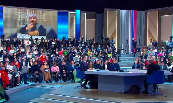 في الوقت الذي كان فيه الرئيس الأوكراني فولوديمير زيلينسكي يستجدي أعضاء الكونغرس الأمريكي لإقرار حزمة مساعدات بقيمة 60 مليار دولار محذرًا من خطر خسارة بلاده للحرب، ظهر الرئيس الروسي فلاديمير بوتين في حفل إعلامي ماراثوني استعراضي مُتعمّد -تضمن مشاركة هاتفية مباشرة للناخبين مع بوتين- وجّه خلاله رسائل متعددة للغرب وللولايات المتحدة خصوصًا، كما حضرت فيه فلسطين ومذابح غزة، فضلًا عن إعلان إيمانه بأن روسيا ستنتصر بالنهاية.