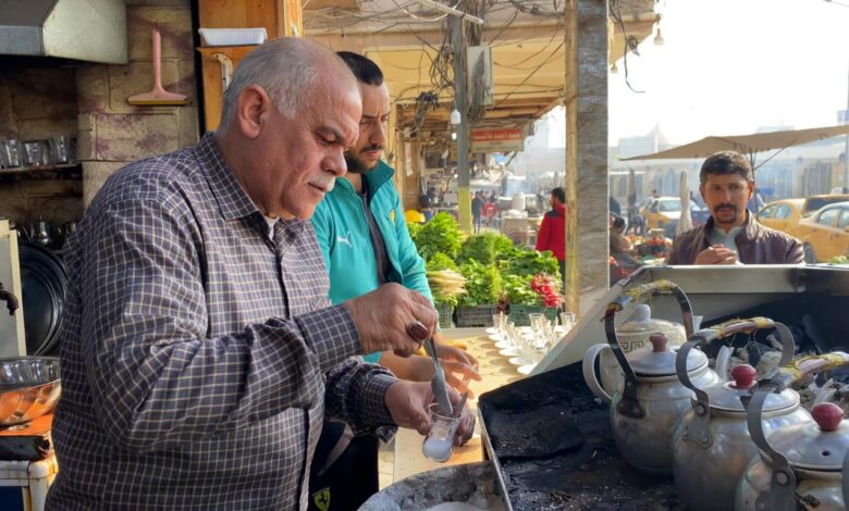 في مكان يجتمع فيه عمال المسطر من الكسبة في مدينة الكوفة، يضج مقهى صغير بالشعر مع أصوات “استكاين الشاي” التي يحركها بخبرته حجي سامي.