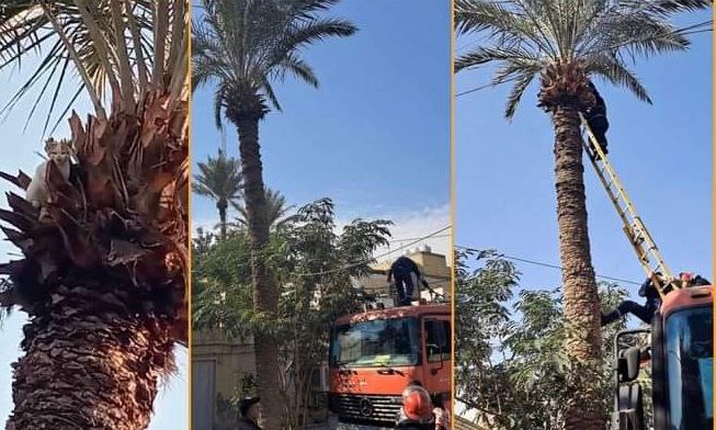 شغلت قطة عالقة أعلى نخلة في مدينة الصدر شرقي بغداد، عناصر الدفاع المدني بعد ان تلقوا نداءً عاجلاً من شاب يسكن في قطاع 26 في المدينة.