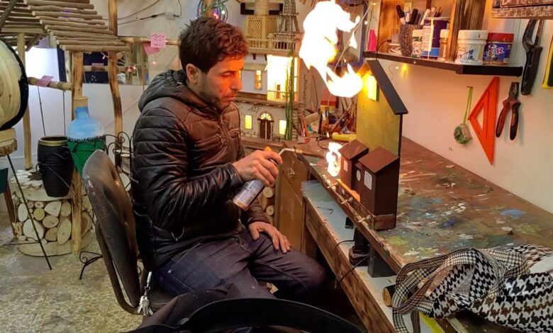 في ورشته المتواضعة بمدينة الموصل يصنع الشاب أحمد الهاشمي مجسمات خشبية كأنها تحف خالصة، قد يصعب وصف درجة الإتقان فيها