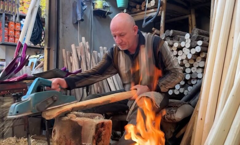 ويضيف: “نبيع هنا مذراع الخشب، والتي تستعمل لجمع التبن والحمص والعدس ونقوم بصنعها مع باقي الأدوات الأخرى، وهي حرفة تراثية قديمة، وأنا الوحيد الذي يقوم بصنع هذه النوعية، وان الكثير من هذه المواد هي من عملنا“.