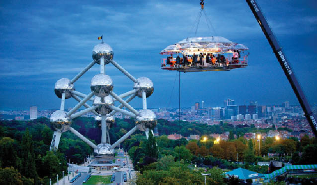 تتنوع أصناف الترحيب البلجيكية بالضيوف والسيّاح، ولكن من غرائب تراحيبها الجديدة أن تتيح لضيوفها فرصة تناول طعام العشاء على منصّة ترتفع عن الأرض خمسين متراً. هو مطعم بلجيكي يطلّ على القصر الملكي في العاصمة البلجيكية بروكسل، ليجمع فيه كل معاني الفخامة والغرابة الفريدة من نوعها في تقديم الطعام. حيث يمكن لهم مشاهدة معالم المدينة كاملة وهم يتناولون وجبتهم المميزة. يطلق عليه اسم “مطعم في السماء” ويضم أشهر الطهاة في العالم، وذلك لإعداد الأطعمة اللذيذة للزبائن ويستقبل في كل مرة فقط 22 ضيفاً، وذلك حرصاً على سلامتهم ، كما لا يسمح باستخدام النار لطهي الطعام في هذا المطعم ويتم تحديد قائمة العشاء حسب طلبات الضيوف وحاجاتهم. كما أن هذه الفكرة في تقديم الطعام فوق عشرات الأمتار من الأرض، قد امتدت من بلجيكا إلى 40 بلد في أنحاء العالم، حيث كانت العنصر الأساس في ما يزيد عن 5000 مناسبة عالمية منها حفلات عرس وترفيه ودعاية ومعارض وشاركت فيها أكبر الأسماء في عالم الطهي مثل بيير جانيير ومارك فيران وغيرهما. يذكر أن أحد المطاعم الحديثة في القاهرة قد قامت بهذه التجربة في مطعم يقع في منطقة التجمع الخامس وينتقل بين القاهرة ومنتجعات البحر الأحمر، حيث يشهد إقبالاً كبيراً من الرواد رغم أن ثمن وجبة العشاء فيه تبلغ 79 دولاراً ويبلغ وزنه 4 أطنان وهو مثبت بكابلات قوية في رافعة ويتسع لاثني عشر شخصاً كما يتم طهي الطعام أمام الزبائن مباشرة.