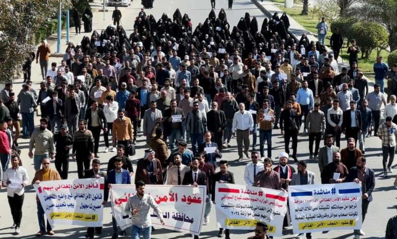 من جهته، قال طارق أحمد، ممثل عقود الأمن الغذائي في النجف: “تظاهرنا يوم السبت السابق، ونتظاهر اليوم للمطالبة بحقوقنا، تعاقدت الدولة معنا في عام 2022 عبر قانون الأمن الغذائي، كبديل لعدم وجود موازنة في ذلك الوقت”.