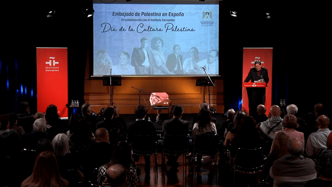 وعلى الرغم من عدم وجود أي كاتب فلسطيني يمثّل الثقافة الفلسطينية في يومها، إلا أنَّ مدير “معهد ثربانتس” الشاعر الغرناطي البارز لويس غارسيا مونتيرو (1958)، أنقذ الموقف عندما استحضر شاعرين فلسطينيّين، الأوّل هو، وكما جاء على لسانه في الكلمة الافتتاحية التي ألقاها، محمود درويش “زميلي الأبدي، الذي كان التزامه بأرضه، فلسطين، التزاماً بالإنسانية”، ولكننا جميعاً نشهد ما تتعرض له فلسطين من انتهاكات لحقوق الإنسان منذ أشهر عدة”، في إشارة إلى الإبادة الجماعية التي يقوم بها الكيان الصهيوني في غزّة منذ 160 يوماً.