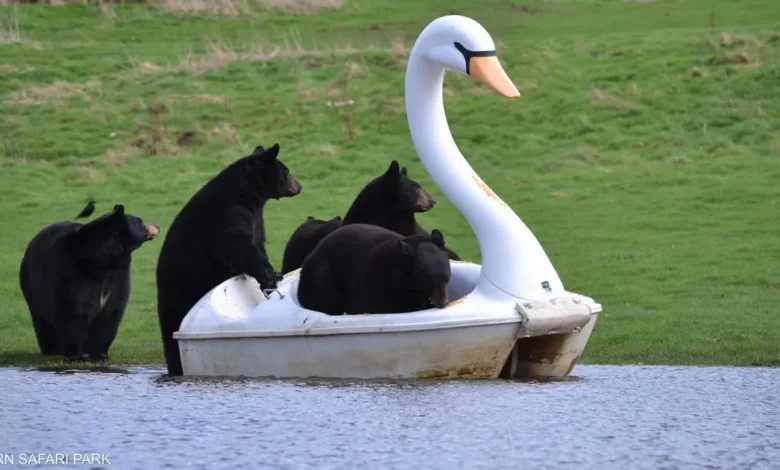 دببة تتنزه مع بجعة وسط “بركة ماء”