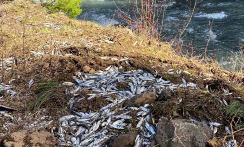انقلبت شاحنة محملة بأكثر من 100 ألف سمكة سلمون، بعد تعرّضها في منطقة جبلية في ولاية اريغون، إلا ان غالبيتها نجحت في الوصول الى مجرى مائي.