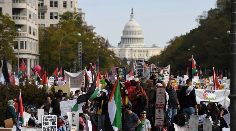 جسّد متظاهرون أمريكيون مؤيدون لفلسطين، مشاهد إعدام تمثيلي وهمي، لما قام به جيش “الكيان” الإسرائيلي بحق المدنيين في غزة.
