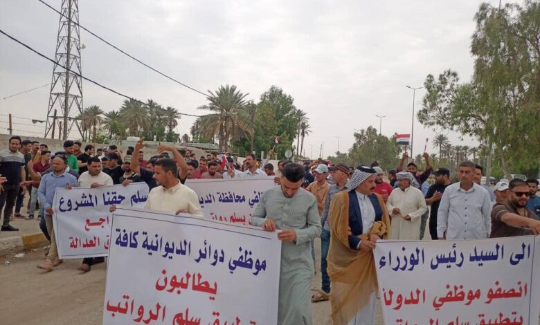 وشهدت أربع محافظات عراقية، تظاهر المئات من الموظفين للمطالبة بإقرار تعديل مشروع قانون سلّم الرواتب، فضلا عن خروج العشرات من العمال للمطالبة بالخدمات.