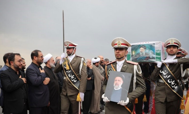 وأقيمت مراسيم تشييع جثامين رئيس الجمهورية ومرافقيه، أمس الثلاثاء، في مدينة تبريز، وبعد الظهر في مدينة قم، كما اقيمت مساء الثلاثاء، مراسيم توديع جثامين الشهداء في مصلى العاصمة طهران، على أن تنطلق صباح اليوم الأربعاء، مراسيم التشييع من جامعة طهران إلى ساحة آزادي (الحرية) بالعاصمة طهران، وهناك ستقام عصر الاربعاء مراسيم بحضور ضيوف ووفود أجنبية في طهران.