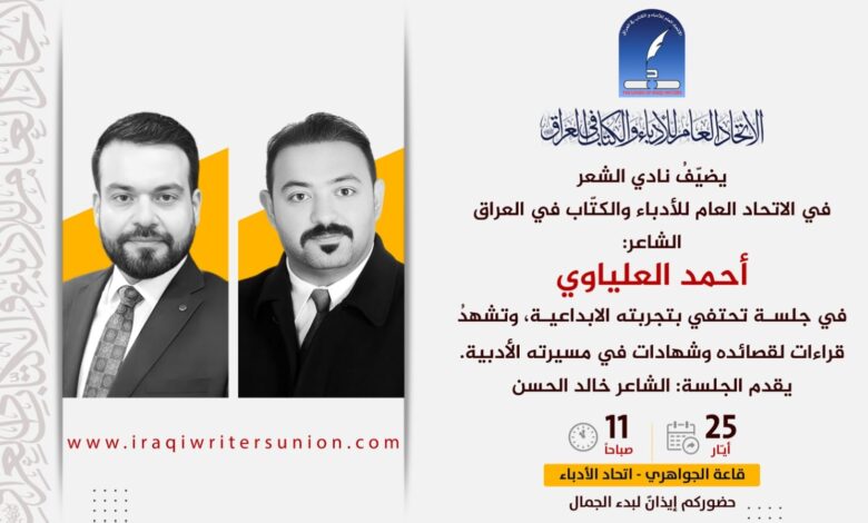 يضيّفُ نادي الشعر في الاتحاد العام للأدباءِ والكتّاب في العراق،السبت، الشاعر (أحمد العلياوي)، في جلسة تحتفي بتجربته الإبداعية ستقام على قاعة الجواهري في اتحاد الأدباء ويقدم الجلسة الشاعر خالد الحسن.