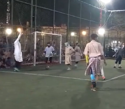 في مشهد انتشر على مواقع التواصل الاجتماعي ليس لغرابته وانما للعفوية التي ظهر فيها، بعد مباراة لشباب في مدينة الفاو بالزي المعتاد “الدشداشة”.