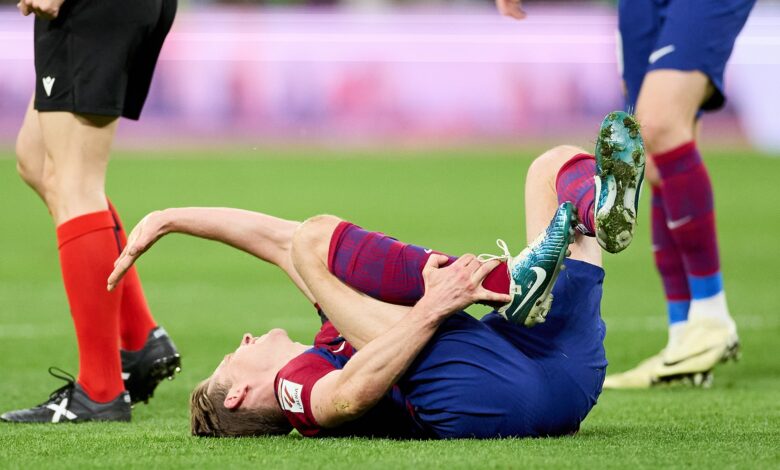 وأشار التقرير، إلى أن دي يونج عانى من 3 إصابات مختلفة في منطقة الكاحل، وخضع لعلاج وتأهيل جنبه أي تدخل جراحي، إلا أن هناك مخاطر التعرض للانتكاس.
