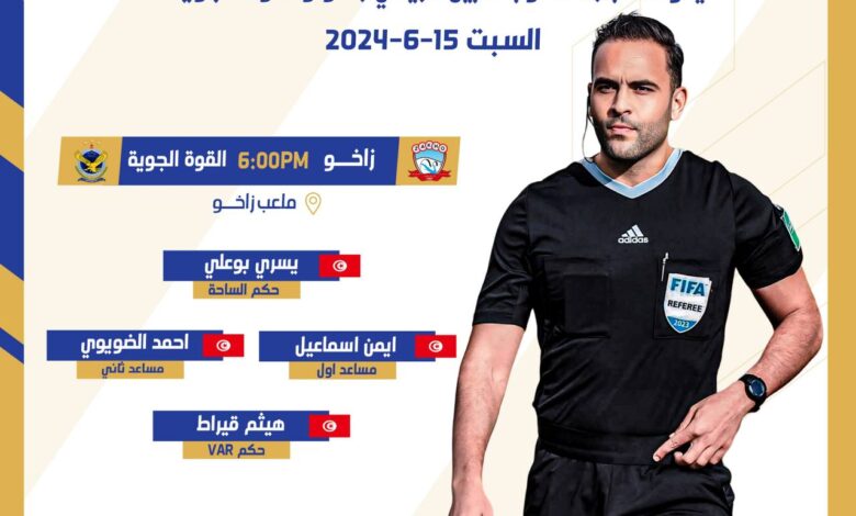 أعلنت لجنة الحكام بدوري نجوم العراق، عن قيادة طاقم تحكيم تونسي لمباراة زاخو ونظيره القوة الجوية.