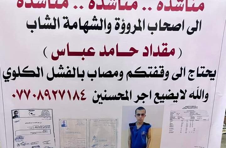 ناشد المواطن مقداد حامد عباس وزارة الصحة والخيرين في بغداد والمحافظات بإنقاذه من الموت كونه يعاني الفشل الكلوي الحاد.
