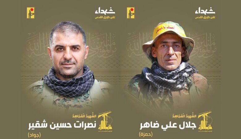 وأفادت المقاومة في بيان ورد لـ”المراقب العراقي” انه ” بمزيد من الفخر والإعتزاز، تزفّ المقاومة الإسلامية الشهيد المجاهد نصرات حسين شقير “جواد” من بلدة الصوّانة في جنوب لبنان، والشهيد المجاهد جلال علي ظاهر “حمزة” مواليد عام 1976 من بلدة حولا في جنوب لبنان، اللذين ارتقيا شهيدين على طريق القدس”.
