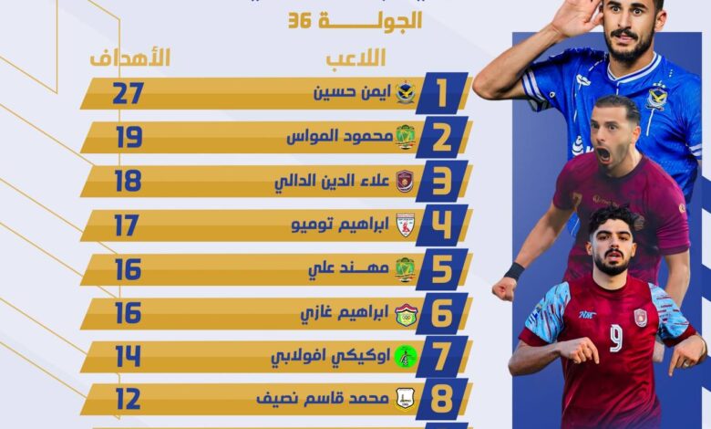 اقترب لاعب القوة الجوية أيمن حسين من حسم لقب هداف دوري نجوم العراق قبل جولتين من نهاية الموسم.