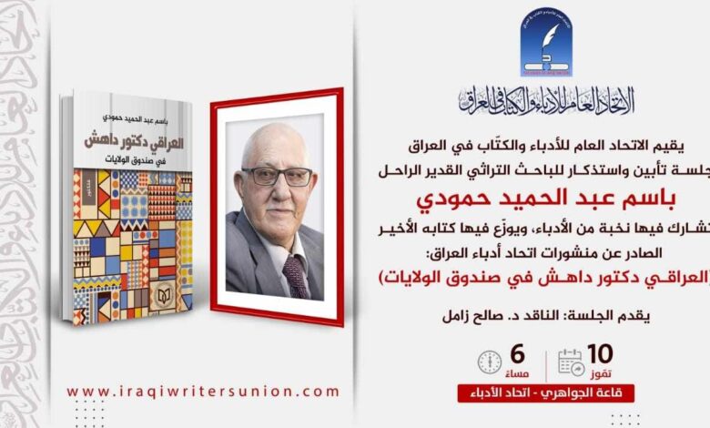 وقال الناطق الإعلامي لاتحاد الأدباء معن غالب سباح في تصريح خصَّ به “المراقب العراقي”: ان “الاتحاد العام للأدباء والكتّاب في العراق، سيقيم جلسة تأبين واستذكار، للباحث التراثي القدير الراحل باسم عبد الحميد حمودي، تشارك فيها نخبة من الأدباء، ويوزّع فيها كتابه الأخير الصادر عن منشورات اتحاد أدباء العراق (العراقي الدكتور داهش في صندوق الولايات)”.