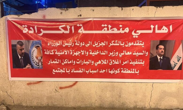 وأضافوا : أنه في الوقت نفسه قام سكان منطقة الكرادة بوضع لافتات لمطالبة الوزير باستمرار الحملة وإبعاد محال الكحول والقاعات الخاصة خارج المناطق السكنية.