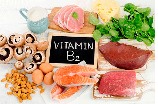 ومصادر فيتامين В2 وفقا له، هي الجبن، والجبن القريش، والبيض، والفطر، والحليب ومنتجات الألبان السائلة، والأسماك، والدواجن، واللحوم الحمراء، وكبد البقر، والحنطة السوداء، والرز، والملفوف الأبيض.